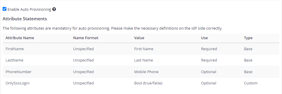 - Enable Auto Provisioning: If enabled, an account will be automatically created for IdP-registered users when they first access Invicti Enterprise. To do so, you must complete the FirstName, LastName, and Phone Number (optional) fields in the Attribute Statements on the IdP side. For further information about OnlySsoLogin, see Provisioning a member.